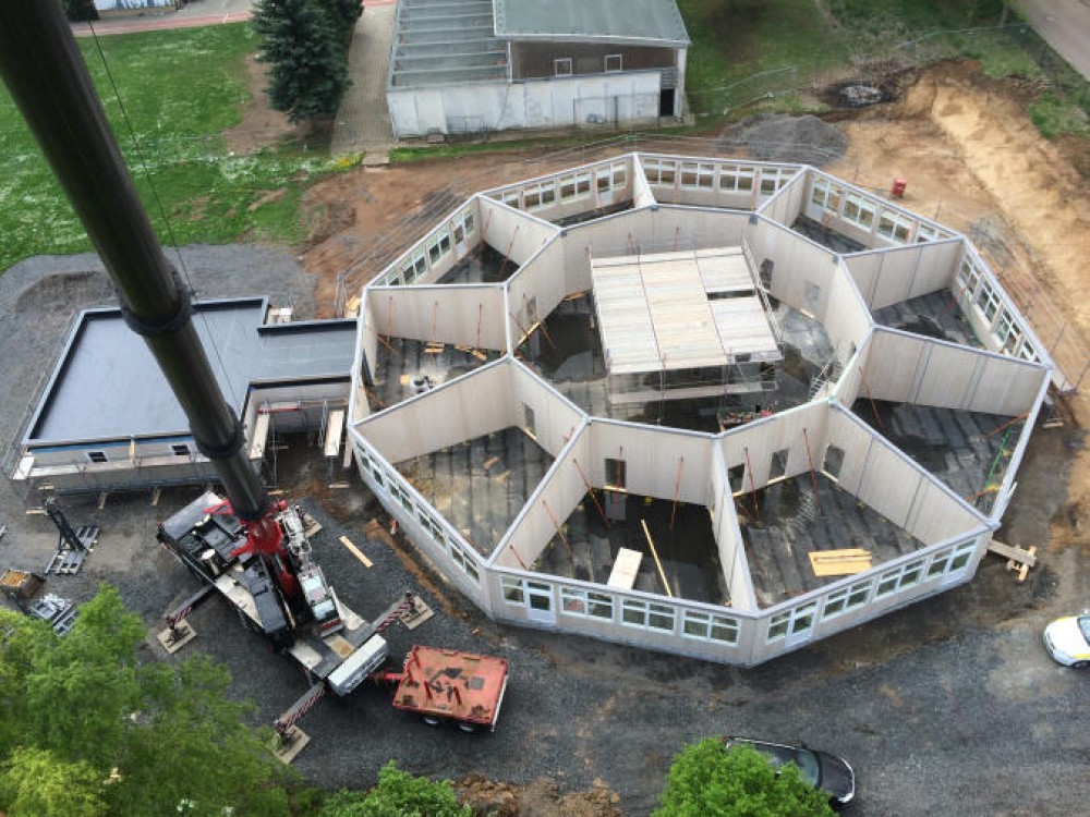 In Ahlsdorf stehen die kompletten Wände und der Seitenbau hat bereits sein Dach erhalten. Und das alles nur nach 1 Woche!