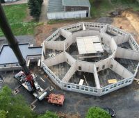 Die Dachelemente sind im Werk bereits bereit und bald wird der Rohbau fertig sein.