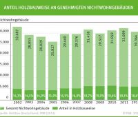 Wie man der Tabelle entnehmen kann, ist der Anteil der neu errichteten Nichtwohngebäude in Holzbauweise in den Jahren 2002 bis 2012 deutlich angestiegen und bewegt sich mittlerweile bei rund 19%.