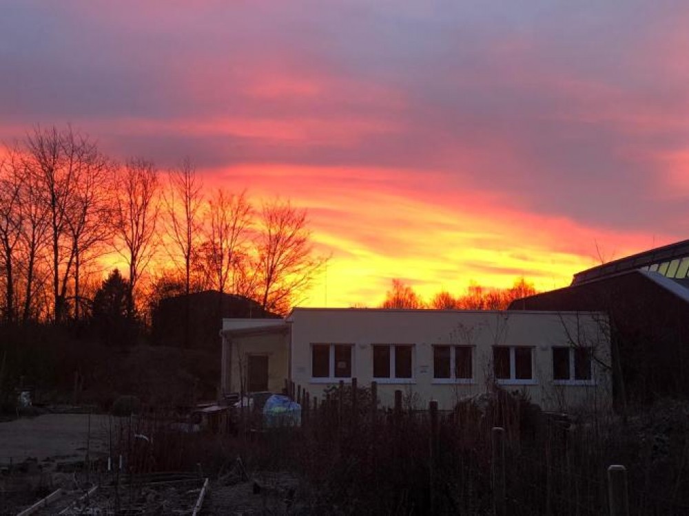 Das Foto wurde von Herrn Nusser heute morgen, 13.02.2020, aufgenommen und zeigt im Vordergrund eine mobile Raumzelle von Nusser Systembau als Erweiterungsbau der Silberwaldschule in Stuttgart-Sillenbuch.