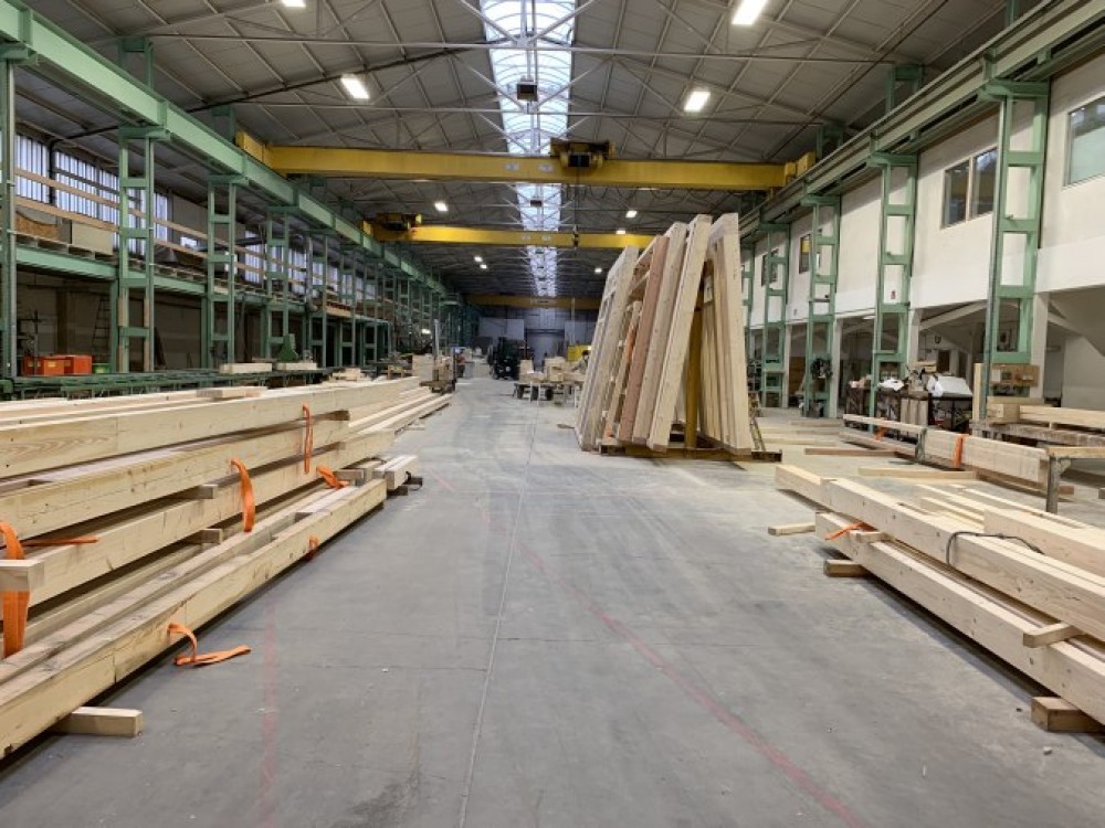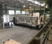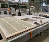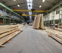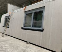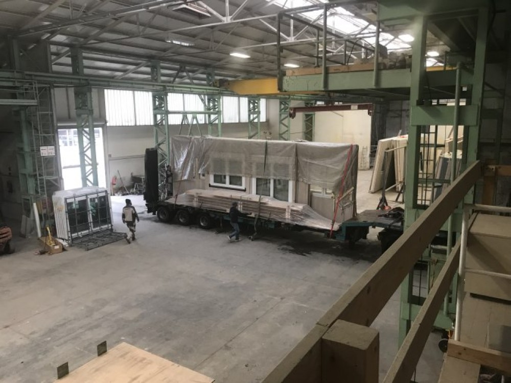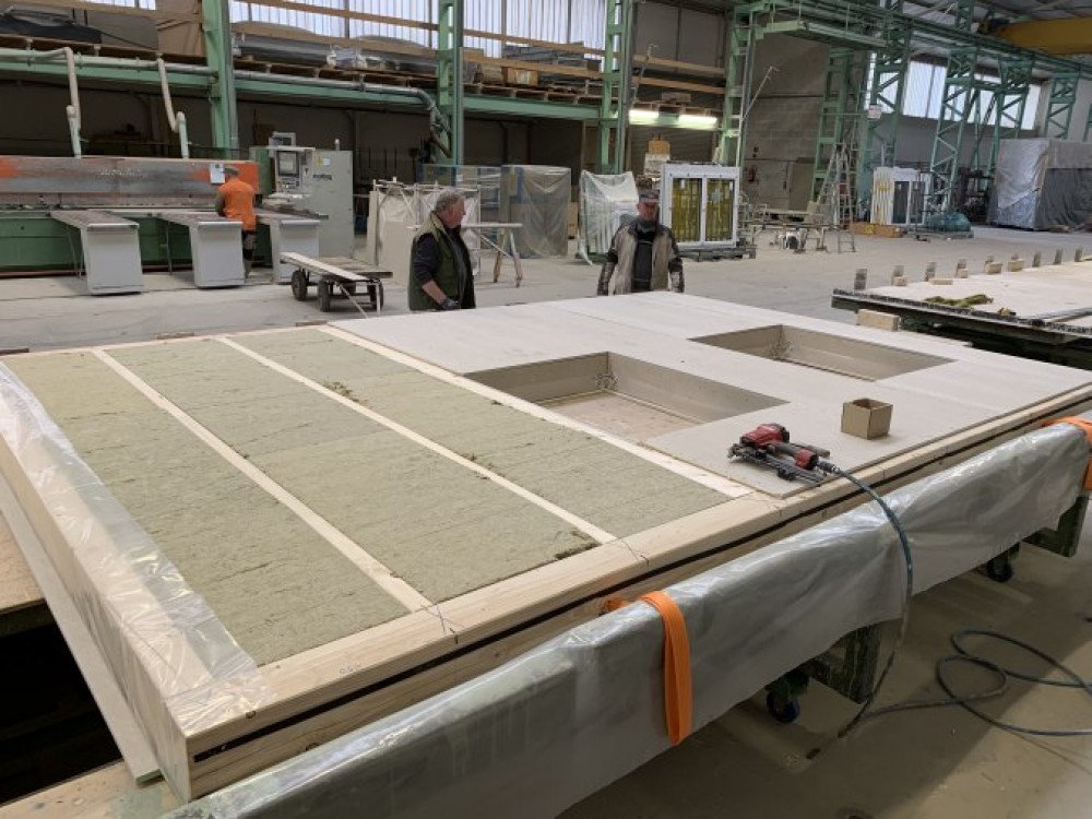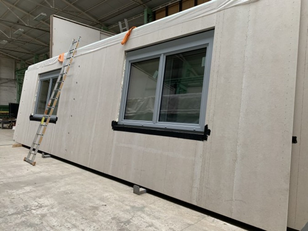 Fertigung und Verladung der Wände mit bereits eingebauten Fenstern.